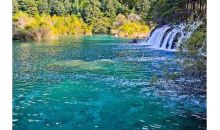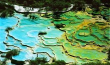 進(jìn)入黃龍景區(qū),首先看到的是一組精巧別致、水質(zhì)明麗的池群--迎賓池。池子大小不一,形狀奇特,色彩艷麗,錯落有致,四周山岳環(huán)峙,林木蔥蘢,山間野花競放,彩蝶飛舞。山間石徑曲折盤旋,點綴著觀景亭閣,倍添情趣。