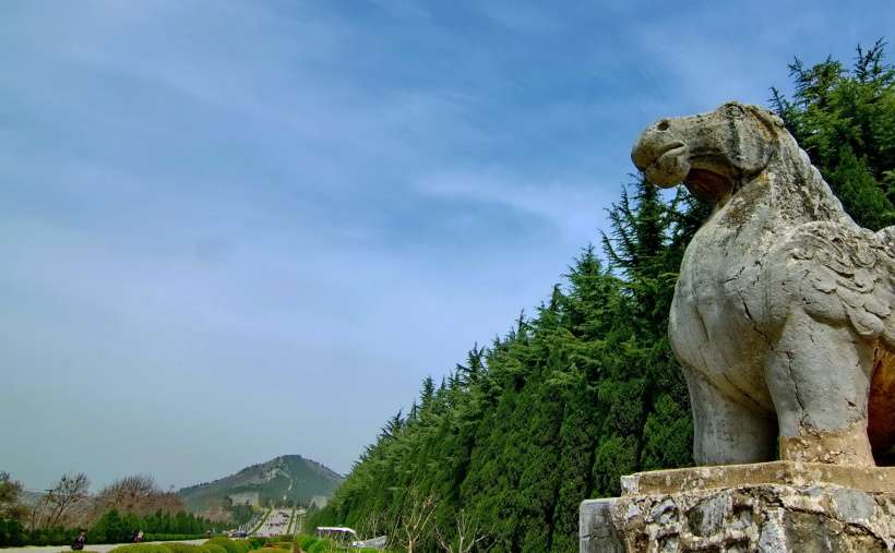 從梁山南二峰的天然雙闕起,往北依次對稱排列。端立首位的是1對高達8米有余的八棱柱石華表,這是帝王陵墓的標志,其造型昭示著生命長存的理念和古代先民對人類生殖行為的崇拜。接著是一對昂首挺胸、渾圓壯觀的石刻翼馬,馬身兩翼雕以卷云紋,似有騰飛之勢。翼馬之北是1對優美的高浮雕鴕鳥,是唐王朝同西域人民文化交流與友好往來的象征。緊接鴕鳥的是5對配有馭手的石仗馬和10對高4米左右的石翁仲(或稱直閣將軍)。