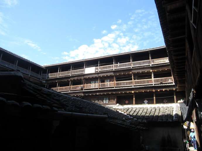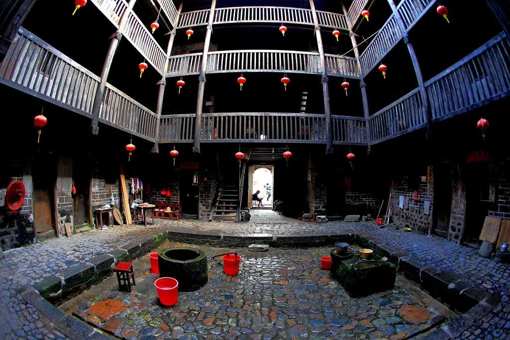 亦有五鳳型,橢圓型,八卦型,永定最多,將近二萬(wàn)多座。南靖亦有一萬(wàn)五千多座。永定以客家人為主,南靖為閩南人.土樓內(nèi)有水井和排水,門(mén)大多只有一個(gè),多的有3個(gè)。房間的窗戶(hù)較小。遠(yuǎn)處看去就是一個(gè)堡壘。門(mén)比較結(jié)實(shí),大多包了鐵皮,晚上大門(mén)一關(guān),非常安全。土樓的中間是祠堂,祠堂有的是獨(dú)立的。