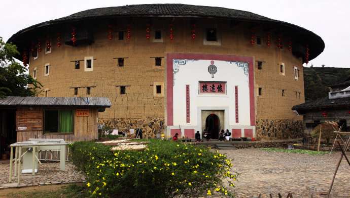 和貴樓每層有28個房間,共有140個房間。樓正中開一個大門,東西南北四方各有樓梯上下。它建于清雍正十年(1732年),據說當初選址建樓,開始并未發現這是塊沼澤地,樓建了一層,忽然整層樓像沉船一樣,慢慢下沉到了爛地里,建樓的簡姓族人無可奈何,只好在下沉的樓墻上打了100多立方米的排樁,他們覺得地基這下牢固了,就從頭開始夯墻,建起了一座五層高的方樓。他們似乎很有把握,從不擔心大樓會傾斜或者下沉,果然兩百多年來,和貴樓固若金湯,風雨不動安如山?,F在,你在樓中學堂的小天井用鐵線往地