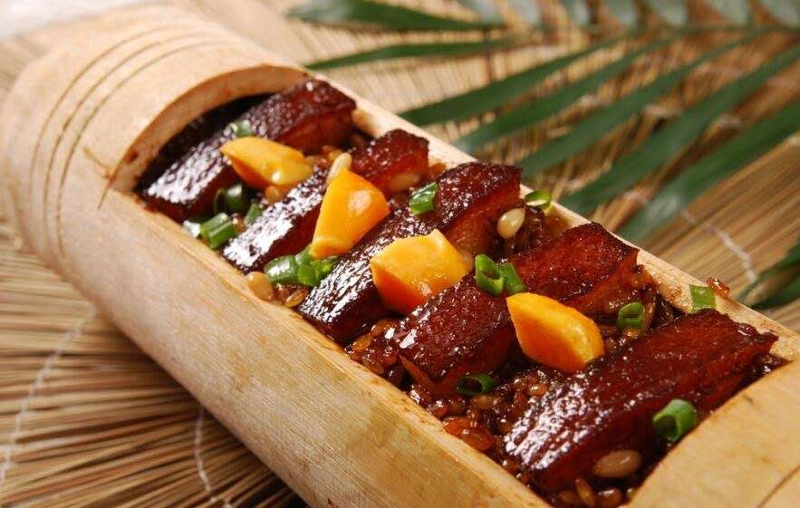 又稱竹筒飯。這種飯是在11月至來年2月,香竹成材之季,將糯米放在竹筒里烤制而成。香竹成材之季,將糯米放在竹筒里烤制而成。香竹的竹節長而細,內壁有一層香氣撲鼻的竹膜,故稱為香竹。傣家人稱香竹"埋毫拉",意思是煮飯的竹。先把香竹按節砍下,每節留一竹節,作為底。然后把淘泡過的糯米放入竹筒,用芭蕉葉塞住竹筒口,將竹筒放進灰里捂(或放烤箱里、火炭上),竹筒口冒出蒸氣10分鐘后,即取出用木錘捶打,使其變軟,食之香味更濃。香竹飯軟而細膩,香氣撲鼻。一般用于招待客人,作為主食。用糯米加工成的食品很多,除香竹飯外,還有黃米飯、"毫諾索"(年糕)、"毫吉"、"毫松板"、米干、米線等40多種。