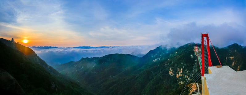 人行索橋為連接天蒙旅游區望海樓和玉皇頂兩個景點的人行天橋,橋跨布置采用38+420+48m 的雙塔單跨吊懸索橋,中跨長度420米,邊跨長度分別為38米和48米,為世界最長、跨度最大的人行索橋。