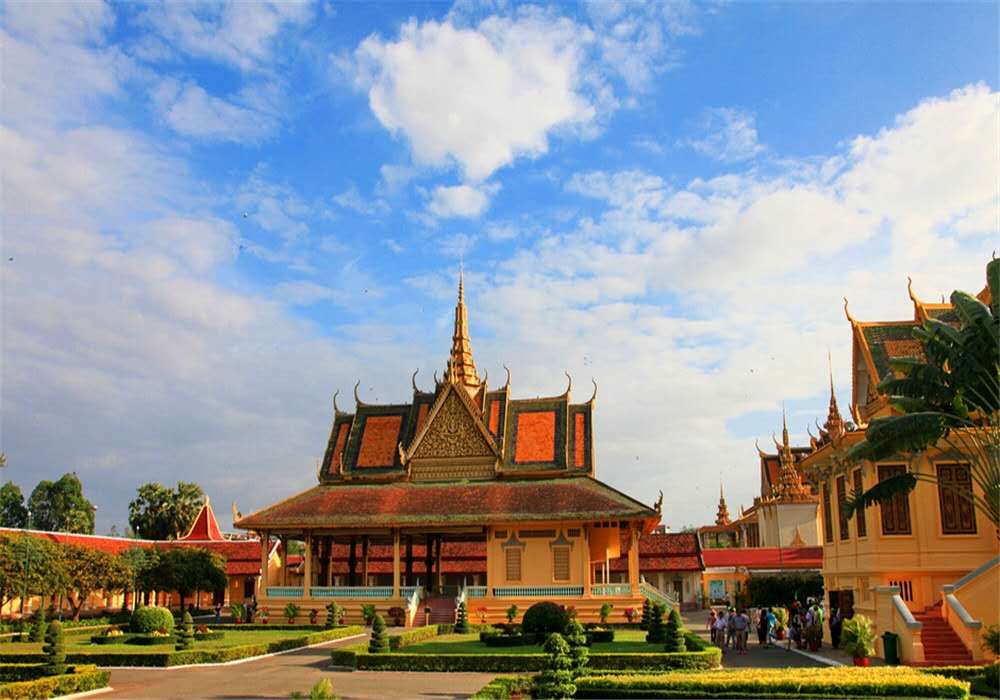 金邊王宮(RoyalPalace)也稱四臂灣大王宮,因位于上湄公河、洞里薩河、下湄公河與巴薩河的交匯處而得名,是諾羅敦國王于1866—1870年建造的。王宮為長方形,長435米,寬402米,外有城墻。王宮的建筑具有高棉傳統建筑風格和宗教色彩,宮殿均有尖塔,代表繁榮;殿身涂以黃、白兩色,黃色代表佛教,白色代表婆羅門教。王宮最初為木結構,后改建為水泥結構,但保持了原來的風貌。王宮內主要建筑有: