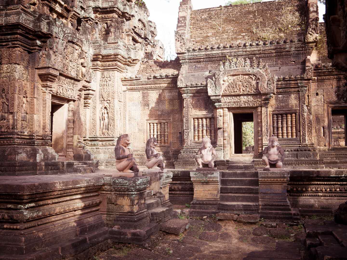 很多人認(rèn)為女王宮是吳哥藝術(shù)王冠上一顆璀璨的明珠。第一眼你可能會因其規(guī)模而感到失望,然而一旦身處其間,你就不能不為裝飾其門廊和墻壁的精美雕刻深深打動。版權(quán)所有山東聊城聊之旅國際旅行社有限公司,轉(zhuǎn)載必究!這些雕刻都圍上了繩索。女王宮在暹粒以北32公里處,最好在接近傍晚時分或者清晨(旅游公共汽車到達(dá)之前)去參觀,因?yàn)檫@時的太陽光線會使粉紅的沙石獲得最佳效果。