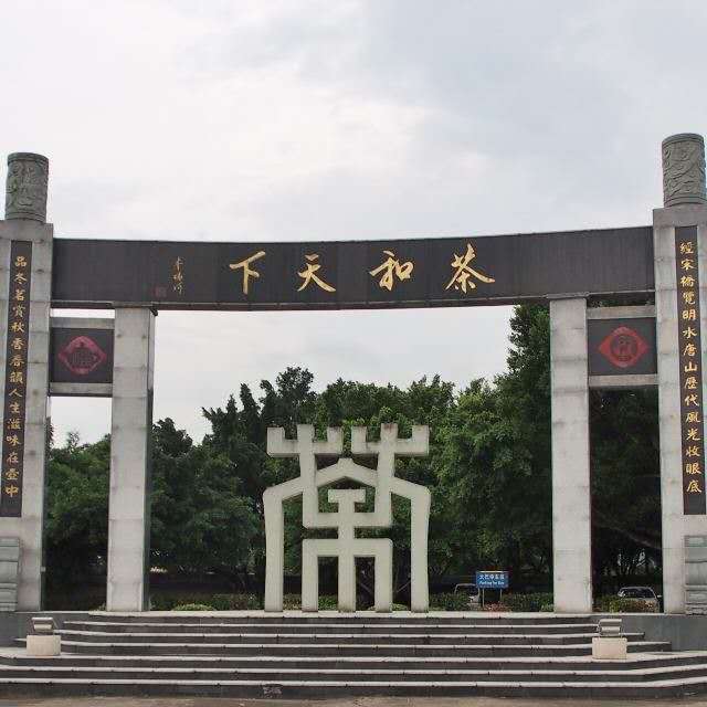 因而頗有意思。在牌樓兩旁寫著“清和”、“精儉”、背后是“誠敬”、“美倫”這八個大字是代表著茶道精神,也是茶博物院的景區質量口號。在牌樓的左側,有一座5米高、15米長的照壁,正面浮雕刻有五位對中國茶文化做出重大貢獻的人物:神農、陸羽、蘇軾、蔡襄、乾隆。