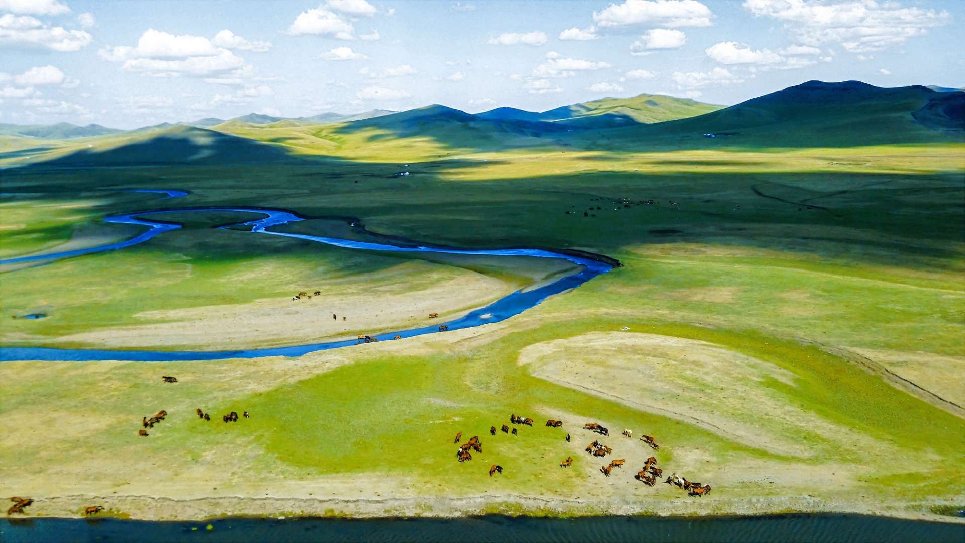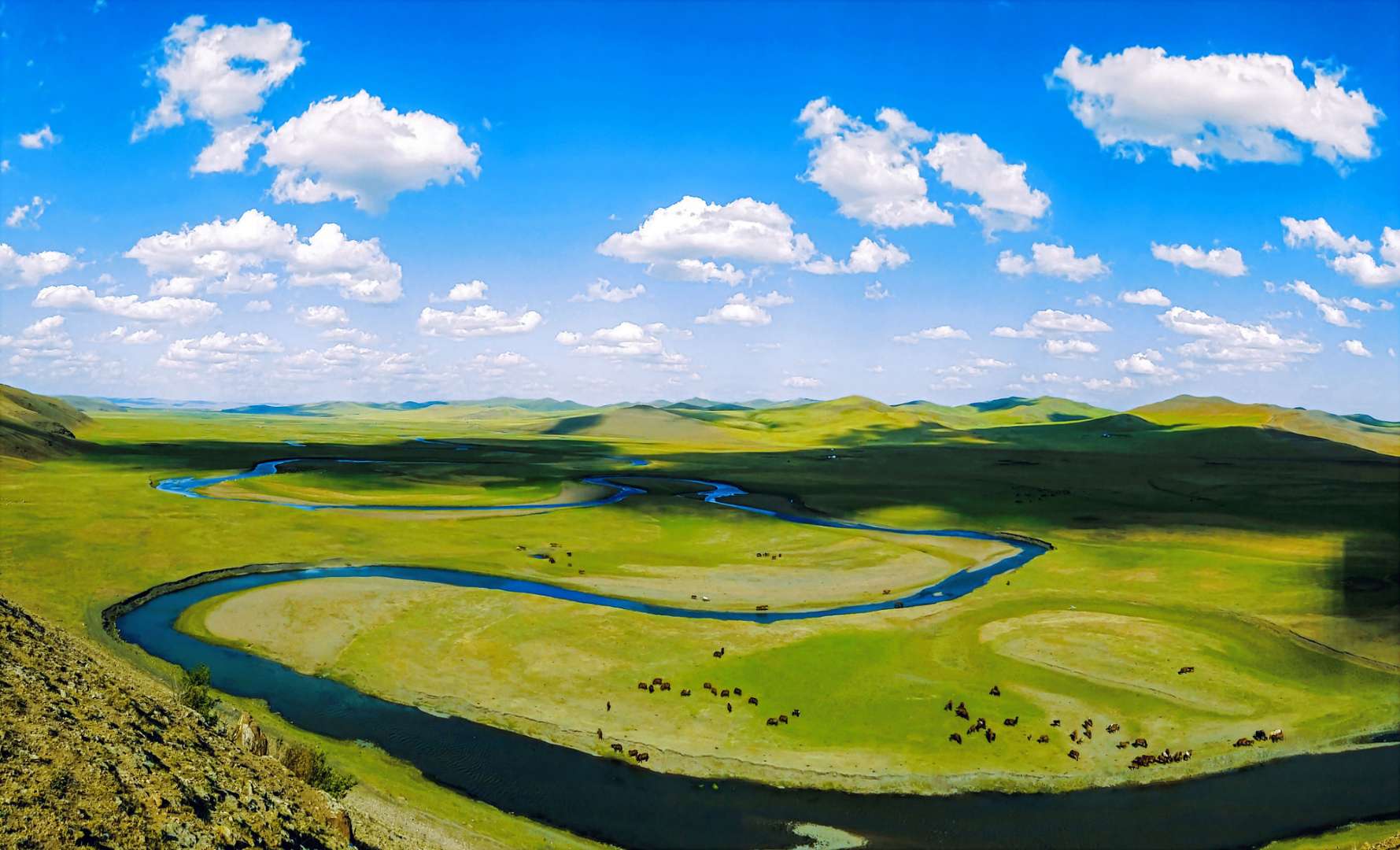 藍天白云下,鑲嵌在一望無際的綠色草原上的莫日格勒河,顯得是那樣嬌柔嫵媚,在這種純自然的優美環境中,騎上駿馬,駱駝,或是坐在勒勒車上,沿著彎彎曲曲的莫日格勒河溜上一圈,再走進蒙古包里喝上幾碗用莫日格勒河水和鮮奶煮就的奶茶,嘗一嘗香氣四溢的手把肉,同牧民聊聊家常,聽牧民講述動人的傳說和故事,那該有多么愜意啊.