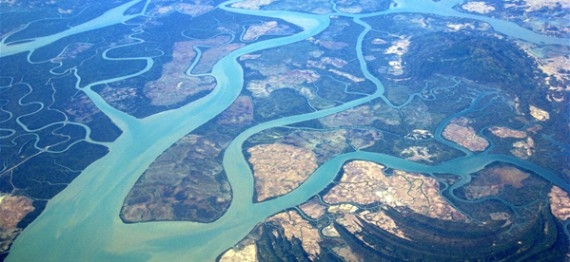 苗旺以南48公里的娘交附近,伊洛瓦底江開始分流,散作傘形分成多條支流流入安達曼海,形成河道交織如網的著名伊洛瓦底江三角洲。三角洲,西從勃生河口東至仰光河口,寬約242公里,南北長約90公里,面積3萬多平方公里。三角洲地區除一些高地外,概為現代沖積平原。地勢低下平坦,一般與海潮線相等,部分則在海潮線之下。由于每年有約3億噸的泥沙傾瀉海內,所以三角洲向外伸延的速度是驚人的,據測量,平均每年向海洋擴展66米左右。