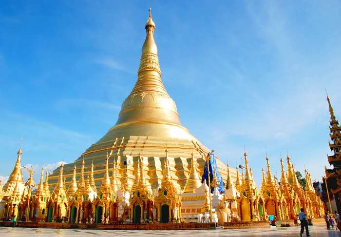 其高度為98米,表面則鋪上了一層金,再加上它是位于皇家圓林西的圣山(Singuttara)之上,所以這座塔也就在仰光市天際線中獨占鰲頭了。它是緬甸中最神圣的佛塔,因為它供奉了四位佛陀的遺物,包括是拘留孫佛(Kakusandha)的杖,正等覺金寂佛(Konagamana)的凈水器,迦葉佛(Kassapa)的袍及佛祖釋迦牟尼的八根頭發。全塔上下通體貼金,加上4座中塔、64座小塔,共用黃金7噸多!在塔頂的金傘上,還掛有1065個金鈴、420個銀鈴,上端以純金箔貼面,頂端鑲有5448顆鉆石和2000顆寶石。