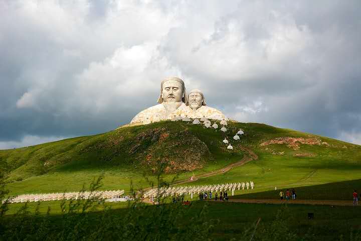 霍林郭勒市可汗山景區總投資5200萬元,占地面積13000余平方米,景區由山門、蒼狼之路、蒙元兵陣和蒙古帝王群四部分構成,其中成吉思汗頭像雕塑高達50米。