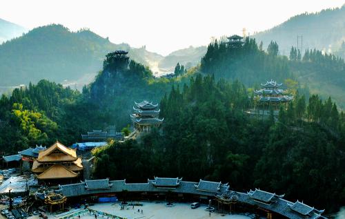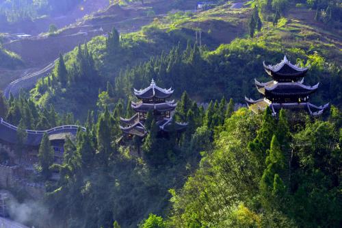 九黎宮:科學利用山水自然資源,因地制宜、依山造勢,順山而居。宮高99米,呈11開間,象征九九歸一之意。建筑由四合院到吊腳樓到沖天樓三合為一,九黎宮內有苗族接龍堂、曬樓虎口堂、四合院、八字朝門和吊腳樓群等多種文化符號,是彭水展示苗族文化、民風民俗的博物館,是目前最大的吊腳樓群。