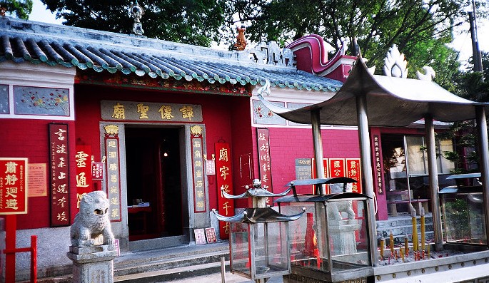 譚公廟位于路環十月初五街尾,與中國大陸小橫琴島極接近。該廟屬道教廟宇,是路環香火最盛的廟宇,建于清同冶年間,也為1862 年。廟內除供奉譚仙圣外,更加置有一只由鯨骨雕制而成的龍舟,是一件已有百多年歷史的文物。廟內的“魚骨舟”為鎮廟之寶,據說摸過鯨骨會行好運,故善男信女進香后必順便摸一摸龍骨。而在廟外一塊刻有《鵝》字的巨形靈龜石,亦為區內一個特色標記。