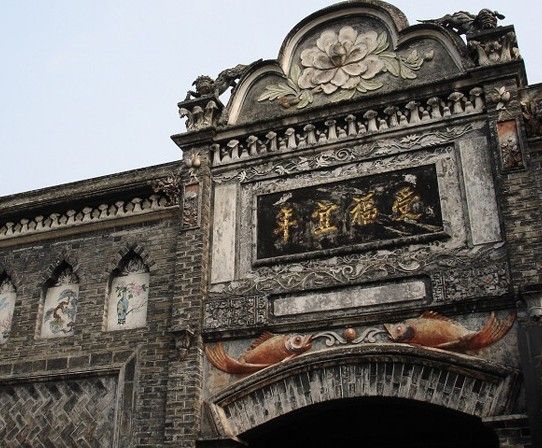 老公館大門整體足有兩層樓高,主體為灰磚墻,勾白縫。一對朱砂色石獅雄踞兩側(cè),黑漆木門門楣上一對紅色鯉魚相向翹尾,兩個魚嘴似在爭搶中間的白珠。其上有四個描金大字——受富宜年,襯了黑底,兩側(cè)拉白瓷條飾。最上部為凸型拱邊,居中一朵粉紅色牡丹浮出墻面。整座大門裝飾繁復(fù),色調(diào)沉穩(wěn)大方。