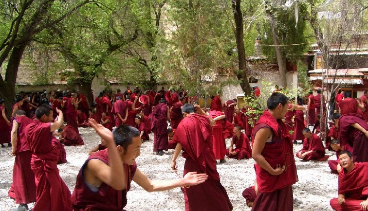 辯經(jīng),是一種佛學(xué)知識(shí)的討論,也可以說(shuō)是喇嘛們的一種學(xué)習(xí)方式。色拉寺的僧人們每天有一次辨經(jīng)活動(dòng)。這是一種富于挑戰(zhàn)性的辯論,雙方唇槍舌劍,言詞激烈,辯論者往往借助于各種手勢(shì)來(lái)增強(qiáng)辯論的力度,他們或擊掌催促對(duì)方盡快回答問題,或拉動(dòng)佛珠表示借助佛的力量來(lái)戰(zhàn)勝對(duì)方。辯論場(chǎng)上的熱烈氣氛使游人也深受感染。