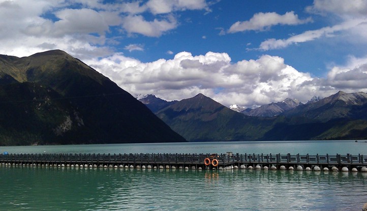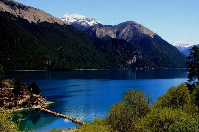 不同于西藏其他的神湖,巴松措(又名措高湖,藏語意為“三巖三湖”)完全被郁郁蔥蔥的原始森林所包圍。確實如它的名字般,巴松措是綠色的,是那種淡淡的玉石般沒有雜質的綠色。湖水清澈得可以看見兩三米下成群游動的魚兒。四周青山如黛,頂峰是終年不化的積雪。湖邊的雪山和湖面倒映的雪山彼此糾纏著,連綿不絕,很是壯觀!最難得的是,現在還很少有人到這里,完全一副與世隔絕的模樣。