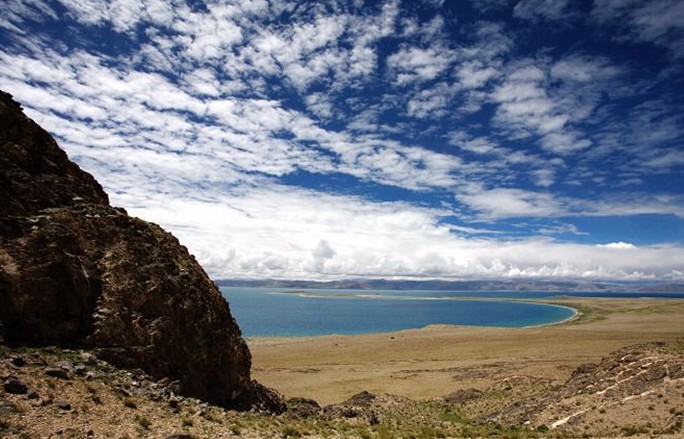 當(dāng)惹雍措是藏北著名神湖,它位于那曲地區(qū)的一個(gè)深陷的湖盆底部,它與當(dāng)惹雍措相毗鄰。當(dāng)惹雍措湖面形似一金剛杵,上圓中細(xì)下部長(zhǎng),四面群山環(huán)抱,南面的達(dá)爾果山山頂積雪終年不化。實(shí)際上當(dāng)窮措與當(dāng)惹雍措是在同一個(gè)湖盆之內(nèi),湖水未枯以前本是同一湖泊。這正是當(dāng)窮措名字的來(lái)歷,藏語(yǔ)里當(dāng)窮措即小的當(dāng)惹雍措之意。據(jù)說(shuō)此湖在一天之中能變換三種顏色。湖東岸是連綿不斷、屏風(fēng)般矗立的褚紅色山壁,它們清晰地記錄了當(dāng)惹雍措湖水一次次下降的歷史。被湖水沖刷而成的階梯從湖畔山頂一圈又一圈地一直環(huán)繞到湖濱。