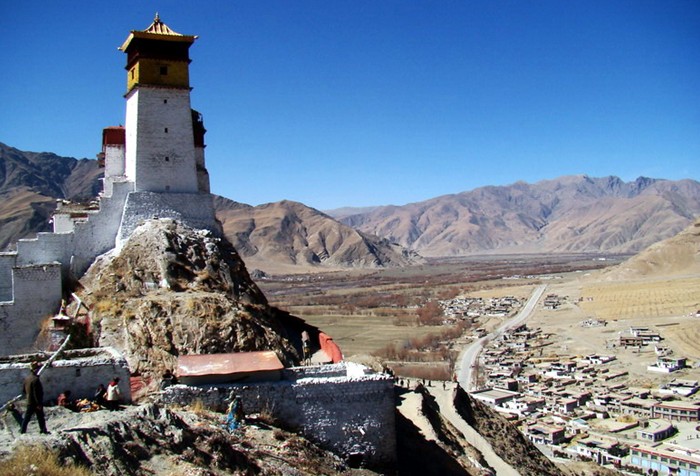 雍布拉康,藏語意為“母子宮”,是西藏歷史上第一座宮殿,也是西藏最早的建筑之一,位于山南地區(qū)澤當(dāng)鎮(zhèn)東南,高聳于雅礱河?xùn)|岸扎西次日山頂。相傳是苯教徒于公元前2世紀為第一代藏王聶赤贊普建造,后來成為松贊干布和文成公主在山南的夏宮,五世達賴時改為黃教寺院。 雍布拉康主要供奉釋迦牟尼佛像。宮殿內(nèi)的壁畫上生動地描繪了西藏的第一位國王,第一座建筑,第一塊耕地的歷史故事。 雍布拉康分為兩部分,前部是一幢多層建筑,后部是一座方形高層碉堡望樓,與前部相連。公元5世紀,藏王托托念贊時期,傳說一本佛經(jīng)從天而降,正好跌在雍布拉康宮頂,當(dāng)時無人能識。有圣人斷言,到了公元7-8世紀就有人能解讀此書。所以這本書被很好地保留在雍布拉康。