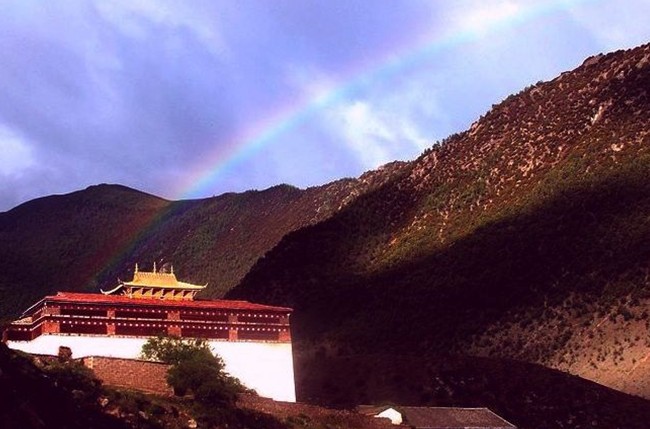 雍布拉康位于澤當(dāng)11公里的扎西次日山上。“雍布”意為“母鹿”,因扎西次山形似母鹿而得名,“拉康”意為“神殿”。雍布拉康是西藏歷史上第一座宮殿。據(jù)史書記載始建于公元前二世紀。松贊干布暑期由宮殿改作寺廟。文成公主初來西藏時每到夏季都會和松贊干布來這里居住。至五世達賴時又在原碉樓式建筑基礎(chǔ)上修了四角攢尖式金頂,并將其改為黃教寺院。