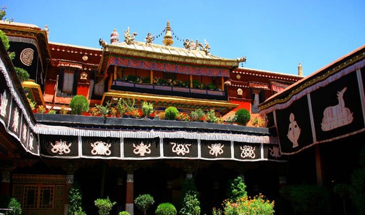 雍布拉康坐落在澤當(dāng)鎮(zhèn)東南約5公里的扎西次日山上,是西藏最早的宮殿。雍布拉康已有2100多年的歷史,3曾建筑。一層的前半部為門廳,面積33平方米,門廳處是一個(gè)帶檐的小平臺(tái)。后半部是佛殿,供奉松贊干布、文成公主等塑像。第二層亦分前后兩部分,前半部分為三面環(huán)繞矮墻的平臺(tái),后半部是帶天井的回廊。五世達(dá)賴?yán)飼r(shí)在碉樓的頂部加蓋了四角攢尖式金頂。雍布拉康除部分僧房外,還有一間曾供歷代達(dá)賴?yán)飦泶硕Y佛時(shí)居住的臥室。