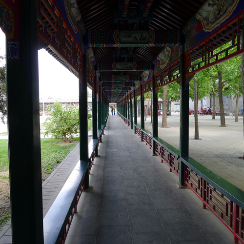 從南門入園,走過門廳,穿過曲折的彩繪長廊,迎面矗立著一座藍琉璃瓦頂的由郭沫若題寫的“保衛和平”漢白玉石坊(原稱“克林德”坊和“公理戰勝”坊)。放眼北望,古柏成林,大多是明代所栽。其中有7株挺拔參天,要三、四人方能合抱。形態各異的古柏相傳為遼時種植,迄今已逾千年。還有一株槐樹與柏樹相抱而生。稱“槐柏合抱”,至今仍枝繁葉茂,蔚為奇觀。由此西行就到了壇門外,一對雄俊的石獅系北宋遺物,是1918年從河北大名的一座古廟廢墟中發掘遷來守門的。