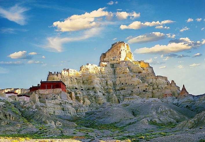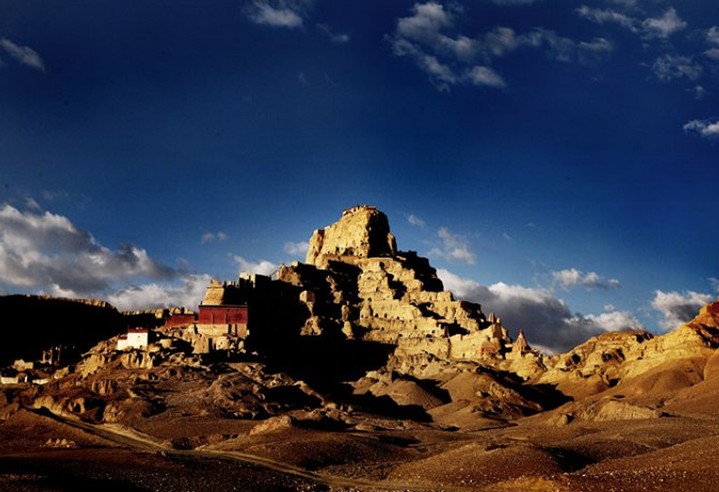 位于阿里地區(qū)的一座土山上。公元10世紀(jì)前半期建立,前后世襲了16個(gè)國(guó)王。王宮城堡是從10-16世紀(jì)不斷擴(kuò)建的。古格王國(guó)遺址占地約18萬(wàn)平方米, 從山麓到山頂高300余米,房屋建筑、佛塔和洞窟密布全山,達(dá)600余座,形成一座龐大的古建筑群。