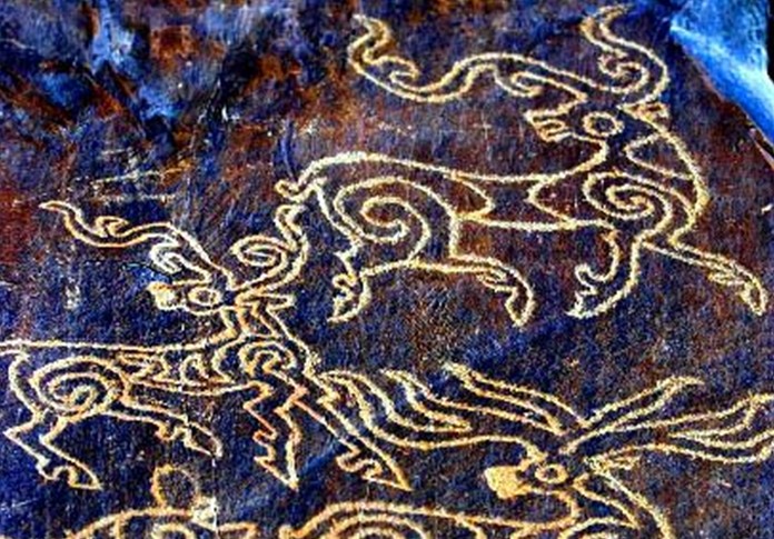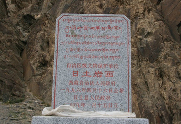 在西藏日土縣境內(nèi)的日松日姆棟、魯日納卡,日土山洞古壁畫(huà)是用堅(jiān)硬的石頭或其它硬物在巖面或巖石上刻鑿而成,線條筆劃有深有淺,還有少數(shù)彩繪畫(huà)面。巖畫(huà)內(nèi)容十分廣泛,有狩獵、宗教祭禮、騎乘、放牧、農(nóng)耕、日、月、山、牛、馬、羊、驢、羚羊、房屋、人物等。