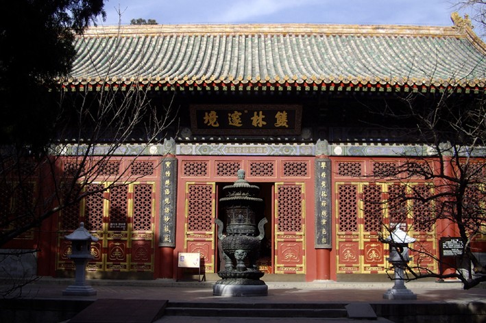 眼前忽一亮,一座四柱七樓的彩色琉璃牌坊無(wú)比輝煌。牌坊匾額為乾隆御筆親題“同參密藏”,背面為“具足精嚴(yán)”。過(guò)了牌坊便是山門(mén),正中門(mén)額上懸著“十方普覺(jué)寺”,原有雍正御筆,現(xiàn)為趙樸初補(bǔ)題。庭內(nèi)有半圓形月池,也稱(chēng)放生池。池上有石橋一座,橋柱的漢白玉雕刻,十分精美。月池左右為鐘鼓樓。山門(mén)后面是天王殿。
