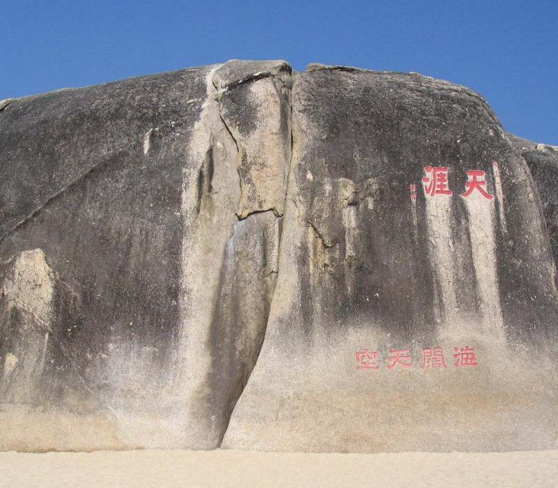 “天涯海角”并非地理位置上的盡頭,而是意境意義上的天涯海角。史載,“天涯”兩字為清雍正年間崖州知州程哲所題,銘刻在一塊高約10米的巨石上。(巖石下方有郭沫若詠“天涯海角”的三首詩題刻)“海角”兩字刻在“天涯”右側一塊尖石的頂中端,據說是清末文人題寫。