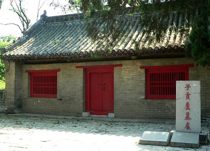 孔子墓西的3間西屋為子貢廬墓處。孔子死后,眾弟子守墓3年,相訣而去,獨(dú)子貢在此又守3年。后人為紀(jì)念此事,建屋3間,立碑一座,題為“子貢廬墓處。”享殿之后,另有一座灰瓦攢尖頂?shù)姆酵ぃQ“楷亭”。亭內(nèi)石碑上刻著一棵古老的楷樹,即摹自其南側(cè)的“子貢手植楷”。相傳子貢奔喪來后,將一棵楷樹苗栽于其師墓旁,后成大樹。清康熙間遭雷火焚死,后人將枯干圖象刻于石上。