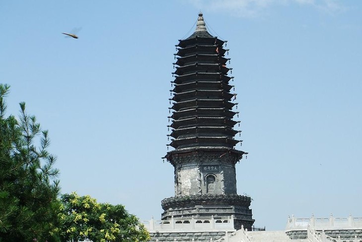 天宮寺塔是原天宮寺的主要建筑。天宮寺始建于遼清寧元年,始稱"南塔院",遼壽昌三年稱"極樂院",乾統五年改稱"天宮寺"至今。天會五年八月敕加"大天宮寺"。天宮寺是一座三進院的寺廟,坐西朝東,分上寺和下寺。除天宮寺塔外,其它建筑主要毀于1928年、1954年和1958年。天宮寺塔為上寺的主要建筑,始建于遼清寧八年,平面為八角形,占地面積50.9平方米,面南背北,為十三層疊澀檐實心塔,高24.2米,塔基為須彌座,束腰部分每面砌有壺門兩個,束腰上部為平座斗拱承托著幾何、花草圖案的欄桿、欄板,最上面是三層磚雕仰蓮包圍著一層塔身,一層塔身最高大,南、東、西、北四面設有假門,其余四面平素,八個轉角處為磚雕盤龍倚柱,普柏枋之上為仿木五鋪作磚雕斗拱,轉角的斜拱與應縣木塔轉角斗拱相 似,上部各檐均用磚疊澀而成。塔剎也是磚疊澀而成。 寶頂為紅銅滲金,重鑄于清康熙十六年。在塔檐上部有兩個塔腔,在1987年修繕中出土了大批珍貴文物,其中一級文物12件,二級文物26件,三級文物33件。