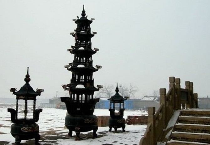 原四寺都有殿堂,據(jù)《盛京通志》卷九十七記載:永光寺原有大殿五楹,碑亭二座、天王殿三楹、鐘鼓樓二座、山門三楹。寺東寶塔一座,禪堂僧房二十四間。延壽寺原有大殿五楹、經(jīng)堂三楹、碑亭二座、天王殿三楹、鐘鼓樓二座、寺西寶塔一座、山門三楹、晾經(jīng)樓一楹、禪堂僧房三十間。廣慈寺原有大殿五楹、碑亭二座、天王殿三楹,鐘鼓樓二座、寺南塔一座、山門三楹……。現(xiàn)在四寺的殿堂,除法輪寺保留大殿五楹,天王殿三楹,東西配殿各五楹,寺北寶塔一座,山門三楹外,其它各寺的建筑均已無存。四塔的建造形式,均為藏式喇嘛塔,是由基座、塔身、相輪三部分構(gòu)成。基座為方形束腰須彌座,有上下框,在四角和每面中間立有兩根石柱,從而每面構(gòu)成三個壸門。石柱上都雕有寶相花、西蕃蓮等紋飾。每面中間壸門置磚雕寶盆和火焰,左右壸門都有高大凸起的磚雕雄獅。基座上框之上又起三層磚砌圓壇座。上面即是寶瓶式塔身塔身的南面辟有佛龕內(nèi)供神牌,佛龕周圍嵌流麗的云珠。塔身之上為十三層相輪,再上為塔剎,版權(quán)所有山東聊城聊之旅國際旅行社有限公司,轉(zhuǎn)載必究!由銅鑄仰伏寶蓋、日、月、寶珠組成。寶蓋之下懸風(fēng)鐸。西塔因年久失修,已殘破不堪,于1968年拆除。西塔塔身內(nèi)出有五谷、松柏樹枝、香泥小塔、金銀塊和金珠、琥珀珠、瑪瑙珠、寶石珠等,還有多種文字的經(jīng)卷。在地宮中出土了銅質(zhì)鎏金天地佛(系密宗大威德金剛),天佛是一頭四面,頭戴王冠,頭上還有一立佛,十二只手臂,手中握有降魔杵,捆仙索,照妖鏡等法器。地佛與天佛相擁,手中也握有法器。天地佛身下懸有許多人頭,腳下踩著一仰一伏的兩個魔身。地宮中還出有塔式小銀盒,盒內(nèi)裝一小葫蘆,玉匜。在一景泰蘭盤內(nèi)裝有琥珀珠、碧璽珠、藍(lán)色料珠、綠松石,紅寶石、藍(lán)寶石,孔雀石,是為七寶,還有果品等。當(dāng)為天地佛供養(yǎng)之物。