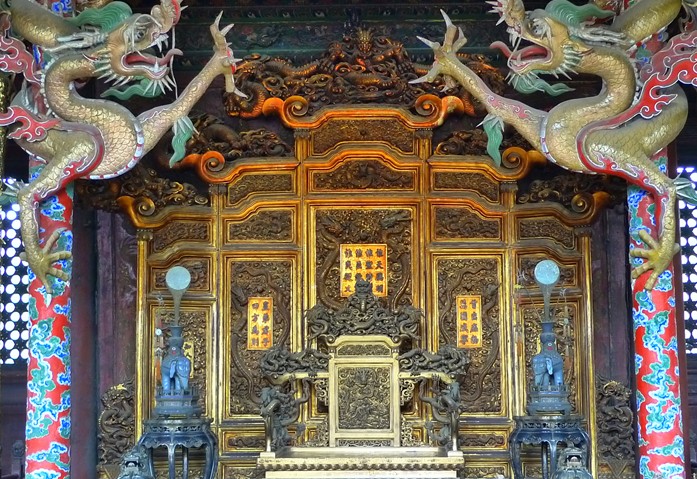 崇政殿:又稱“金鑾殿”,通稱“正殿”,是皇太極處理政務(wù)、接見使臣的場(chǎng)所,清代歷朝皇帝東巡祭祖時(shí)也在此聽朝理政。面闊五間,綠剪邊黃琉璃瓦,單檐硬山頂,前后有出廊,圍以石護(hù)欄。殿內(nèi)為徹上明造,和璽彩繪,寶座后有貼金龍扇屏風(fēng),旁為貼金蟠龍柱。殿外庭院左右有飛龍閣、翔鳳閣、東七間樓和西七間樓。