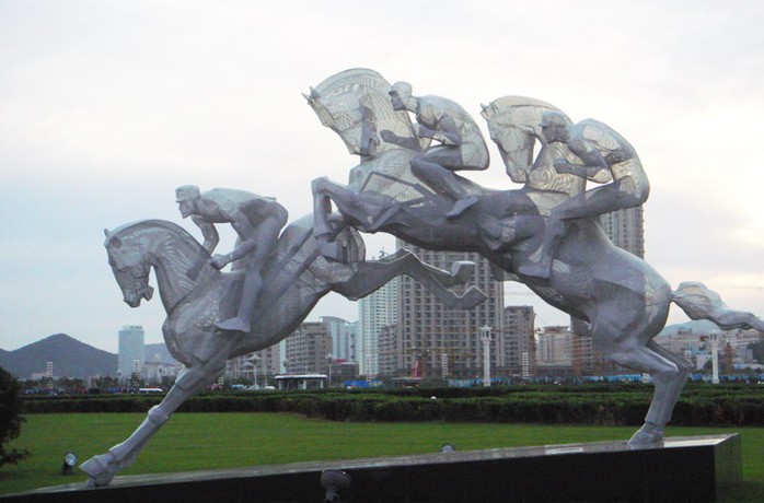 總占地面積176萬平方米,廣場中心由999塊四川紅色大理石鋪設(shè)而成,紅色理石的外圍是黃色大五角星,紅黃兩色象征著炎黃子孫。廣場周邊還設(shè)有5盞高12.34米的大型宮燈,由漢白玉柱托起,光華燦爛,與華表交相輝映。廣場四周,雕刻了造型各異的9只大鼎,每只鼎上以魏碑體書有一個大字,共同組成"中華民族大團結(jié)萬歲",象征著中華民族的團結(jié)與昌盛。