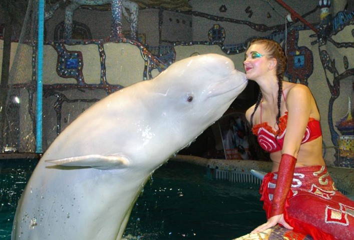 海豚和白鯨是來(lái)自不同海域的動(dòng)物,將它們放到一個(gè)表演池中表演,是海洋動(dòng)物表演的突破。