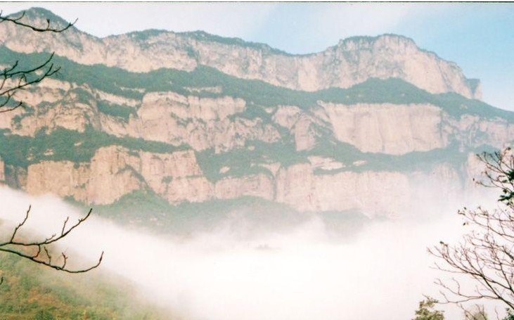 如果誰要是不知“層巒疊嶂”這個(gè)詞的確切含義,就到嶂石巖去讀吧。它的山巒成三疊,每一疊都如紅色屏 嶂石巖風(fēng),高一二百丈,廣數(shù)里,石壁光滑如磨,纖草不生,飛鳥難落,猿猴難攀。每兩疊間錯落成平臺,樹茂草豐,呈綠色環(huán)帶。