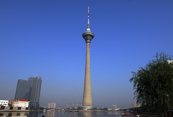 天津廣播電視塔簡稱“天塔”,位于天津西南,四周是 210,000 平方米的湖。“天塔”以水上天塔而著稱。“天塔”高為 415 米。在塔的 248 米和 278 米之間是一個七層的飛碟型的建筑。飛碟結構的總面積為 4,500 平方米。除了廣播間和電力間(260m-378m)之外,還有三層覆蓋了大約 1,300 平方米的面積。第一層中是仙客來餐廳(248 米),這里提供中餐、宴會服務和卡拉OK 包間。可同時容納 100 人。
