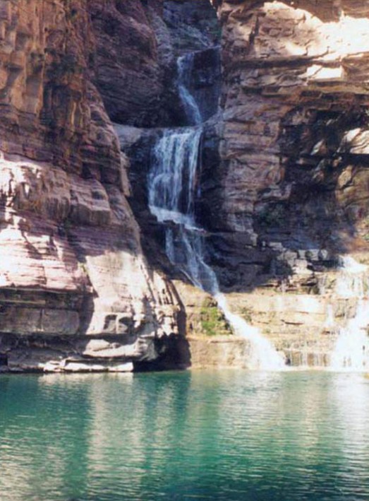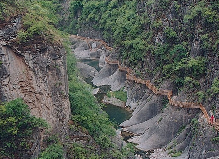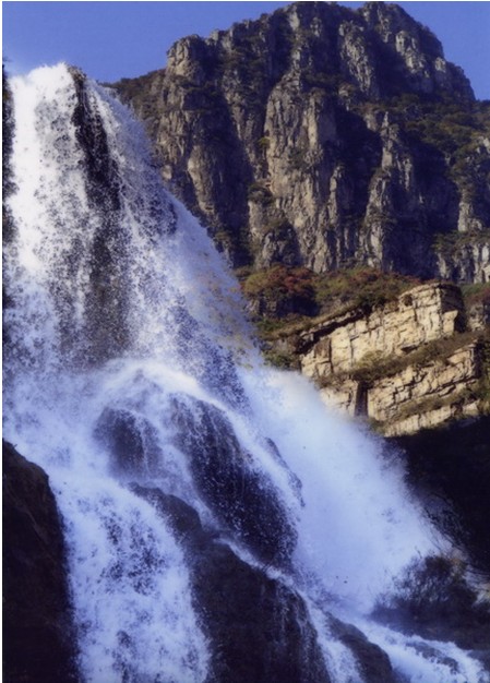 女妖洞口好似魚口,呈橢圓形,高20余米,寬10余米,距崖底20米。洞內有地下暗河流淌,洞口常年往外流水,雨季洞水如柱,噴射而出,版權所有山東聊城聊之旅國際旅行社有限公司,轉載必究!從20米高的懸崖峭壁上跌下來,落到20米外山坡上,濤聲如雷,氣勢壯觀。旱時水流如帶,沿著裸露的巖壁流下,匯入崖底深潭。水潭方圓400平方米。深不見底,高聳的懸崖峭壁倒映在水中,湖光山色,如入畫境。待到水位高漲,潭水漫過潭,順山勢直瀉山底,一路上隨著高低不等的落差,形成三道梯級瀑布,其中第一級瀑布寬5米、高10米,第二級瀑布寬7米、高20米,第三級瀑布寬3米、高30米,經過三級瀑布,潭水最終匯入東流的郊溝河中。