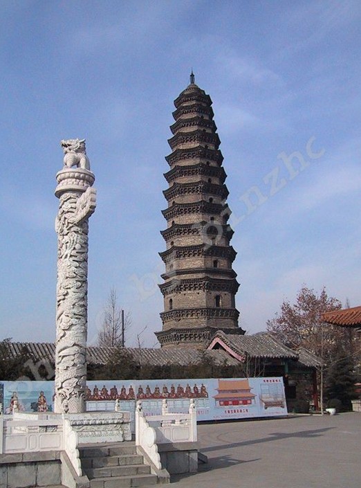 七寶塔在山西平順縣城西北23公里大云寺前。周顯德元年(公元 954年)建。通體用堅硬青石雕造。原為七層,現(xiàn)存五層,高為六米。下三層平面八角形。第一層雕寶裝蓮花、獅子、麒麟、飛馬等。第二層雕伎樂人,體態(tài)輕盈,舞姿優(yōu)美,伴奏者栩栩如生。第三層轉角處雕絞龍柱,回旋盤繞。塔檐下飛鳳、飛仙、共命鳥等變化多姿。檐下周匝垂帳,正面券門上雙龍戲珠,門側侍立二天王。后面比丘半掩門。兩次間二力士分立左右。第四層周匝垂帳,前后有假板門。第五層上覆大圓蓋寶珠頂。此堪設計精巧,雕造頗佳,獨具匠心。