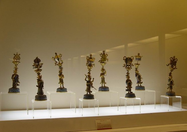 簡介:人物形象神態各異,造型生動。表面涂金。