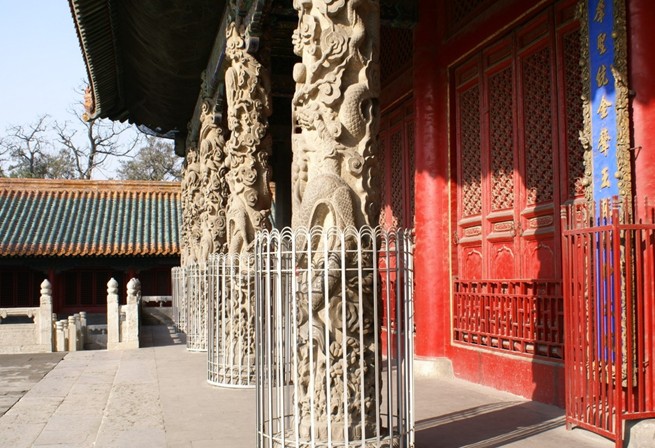大成殿為孔廟之主殿,唐代稱“文宣王殿”。“大成”乃因宋徽宗趙倩尊孔子為“集古圣先賢之大成”而改名為“大成殿”,并御書匾額。大成殿不僅殿宇宏大,裝飾華麗,為全國孔廟之冠,而且此殿前檐十根雕龍石柱,龍姿飛揚,為宮殿建筑中前所未見,連紫禁城的龍柱也相形見細。據傳每當皇帝前來祭孔時,要將龍柱用紅縷包裹起來,以免皇帝發現,犯殺頭之罪。殿內正中奉把孔子塑像,兩旁為四配和十二哲的塑像。殿前東西民廊原供孔門弟子及儒家歷代先賢,現已辟為陳列室,陳列著歷代碑刻,為書法、繪畫、雕刻的藝術寶庫。寢殿后的圣跡殿,藏有明代石刻連環畫120幅,記述了孔于的業跡。故宅井后的魯壁為秦始皇焚書坑儒時,孔子第九代孫孔鮑收藏《尚書》、《禮記》、《論語》、《孝經》等的夾墻,人們為了紀念孔鮑保護古代文化的功績,特地修建了這個魯壁。