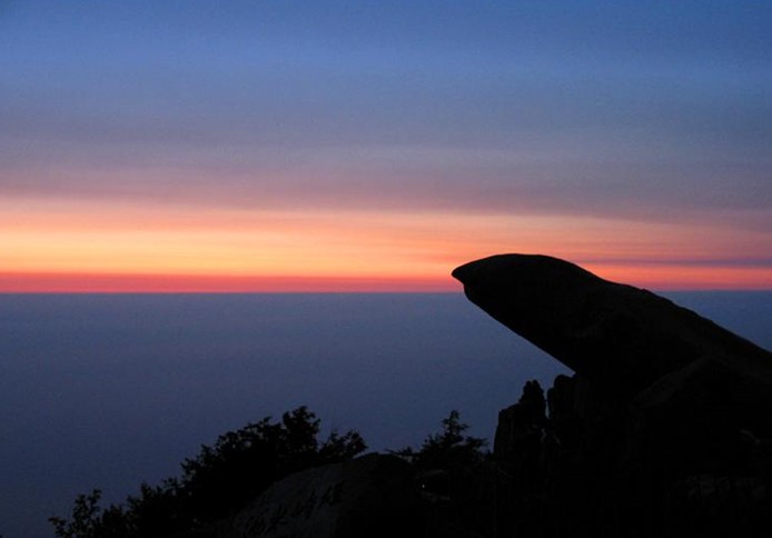 探海石,是位于岱頂?shù)囊粔K突兀伸出的怪石,其上可觀云海玉盤奇景。夏天,雨后初晴,大量水蒸氣蒸發(fā)上升,加之夏季從海上吹來的暖溫空氣被高壓氣流控制在海拔 1500米左右的高度時,如果無風(fēng),在岱頂就會看見白云平鋪萬里,猶如一個巨大的玉盤懸浮在天地之間。遠(yuǎn)處的群山全被云霧吞沒,只有幾座山頭露出云端;近處游人踏云駕霧,仿佛來到了天外。微風(fēng)吹來,云海浮波,諸峰時隱時現(xiàn),像不可捉摸的仙島,風(fēng)大了,玉盤便化為巨龍,上下飛騰,倒海翻江。