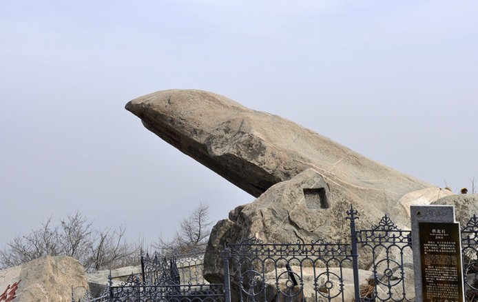 當(dāng)你登上五岳之尊的泰山之巔,你一定會去玉皇頂東側(cè)的觀日峰,因為那里是晨望日出奇觀,暮觀晚霞美景,晴賞山河壯麗,陰看彩云飛渡的最佳去處。在日觀峰上,有一巨石向北(偏西8°左右)斜上橫出,名為拱北石,仿佛一只報曉的雄雞,翹首以待,猶如起身探海,故又名探海石。拱北石平地向前探出兩丈多遠(yuǎn),象一把帶鞘的利劍斜刺蒼天。長近10米、寬約3.2米、厚為1.5米左右。此石與地面夾角為30°,高出周圍地面,其北、東兩面均為懸崖峭壁,顯得神奇而又險峻。學(xué)者王克煜說,探海石是岱頂著名景點之一,也是泰山的象征和重要標(biāo)志。它像一只報曉的雄雞,氣宇軒昂地佇立在泰山之巔,翹首以待,為世人迎來輝煌的黎明。清代著名清官李興祖曾為此留下“才聽天雞報曉聲,扶桑旭日已初明。蒼茫海氣連云動,石上有人別有情”的詩句。