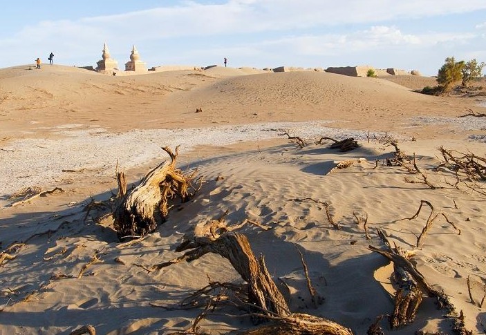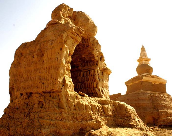 1350年前后,這里的情況發(fā)生了巨大的變化。昔日的綠洲,被沙漠吞噬,變成了一片荒漠。昔日繁華昌盛的黑水城也變成了一座廢城。現(xiàn)在它們的痕跡依稀可辨。磚石,瓦塊,陶瓷殘片,鐵器,雕刻,泥佛,風(fēng)化的白骨,破裂的石磨,塊壘等當(dāng)年的遺物。在古城遺址的西北角上,端坐著12米高的西藏覆缽式佛塔,古樸,圓融,安詳,是黑城的標(biāo)志性建筑。城內(nèi),荒涼滿(mǎn)目,流沙下遍布官邸、寺廟和民居的頹垣斷壁,到處都散落著各種瓷器和碎片。黑釉刻花、白釉褐彩,以及鈞瓷和南方的龍泉瓷等等。城外還有幾座殘缺不全的喇嘛塔,像是守城的衛(wèi)士肅然而立。