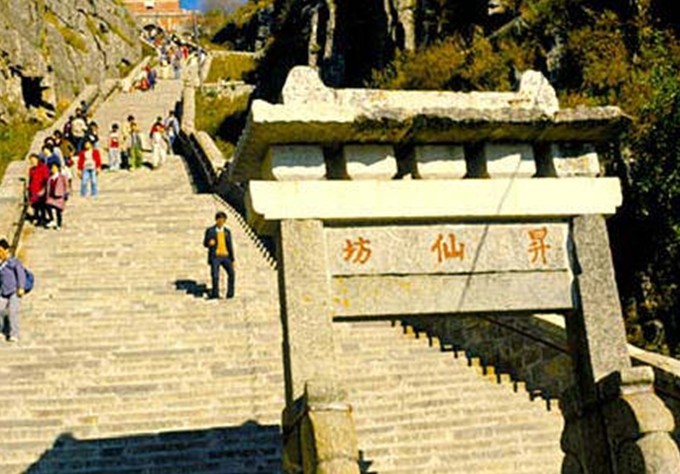 升仙坊位于山東省泰山中路緊十八盤的起始處,為兩柱單門式石坊,額題楷書“升仙坊”。此處山勢陡峻,懸崖峭壁,上臨岱頂天庭,咫尺仙境,似有飄然升仙的意境,故名“升仙坊”。游人至此小憩,每每浮想聯翩?;匾暽较?,常有騰身云霄之感,舉首仰望,南天門近在眼前,奮力攀登,岱頂在望。
