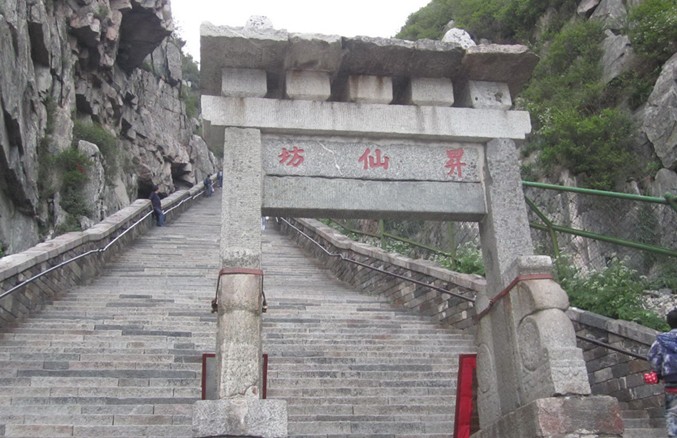 升仙坊位于山東省泰山中路緊十八盤的起始處,為兩柱單門式石坊,額題楷書“升仙坊”。此處山勢陡峻,懸崖峭壁,上臨岱頂天庭,咫尺仙境,似有飄然升仙的意境,故名“升仙坊”。游人至此小憩,每每浮想聯翩?;匾暽较?,常有騰身云霄之感,舉首仰望,南天門近在眼前,奮力攀登,岱頂在望。 升仙坊位于南天門下。全石雙柱單門式,寬2.82米,通高4.5米,建于雙層方 石基上。基石長1.82米,寬0.64米,高0.5米。柱方形,下施滾墩石,獸頭石鼓狀。