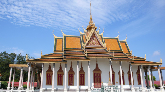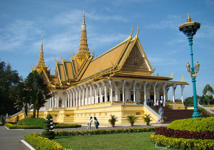 金邊皇宮(Royal Palace),也稱四臂灣大皇宮,建造于1866-1870年 。坐落于金邊東面,面對湄公河、洞里薩河、巴沙河交匯而形成的四臂灣,屬于典型的高棉式建筑。王宮為長方形,長435米,寬402米,外有城墻,里面共有20余座建筑物。建筑極富高棉傳統風格和宗教色彩,多為黃、白兩色,黃色代表佛教,白色代表婆羅門教,所以看上去金燦燦的。
