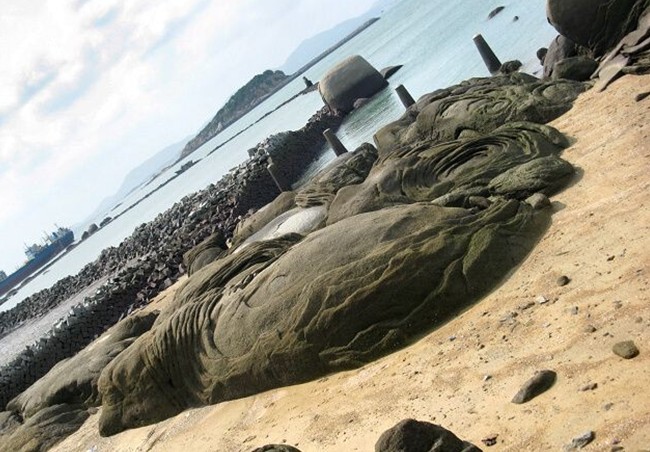 與半洋石帆相對應(yīng),在看澳村海邊,由于海水侵蝕和自然風(fēng)化,巖壁花崗巖風(fēng)化,形成一座光頭凸肚的彌勒佛像。石像曲膝盤坐,身高12米,肩寬12米,頭、身、手、足畢現(xiàn),形象生動,狀如半浮雕。版權(quán)所有山東聊城聊之旅國際旅行社有限公司,轉(zhuǎn)載必究!圍繞佛身有一條棕黃色的火成巖脈,就象獻(xiàn)給佛像的一條金色“哈達(dá)”,也是自然巧合 ,佳趣天成。另外,這里還有許多天然海蝕景觀,例如雙龜接吻,青蛙等,值得一看。