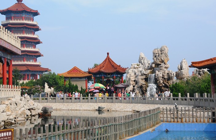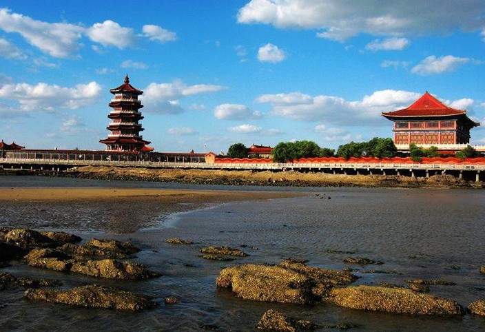 “望瀛樓”三個字是當(dāng)代書壇泰斗啟功先生所題。據(jù)司馬遷《史記》記載,在東海之濱有三仙山,蓬萊、瀛洲、方丈,山上住著仙人,還有長生不老之藥,山上的亭臺樓閣均是黃金白玉所做,登此樓就可望到海上仙山。望瀛樓由六層組成,水上四層,水下兩層為海洋世界。海洋世界展示了幾百種珍奇的海洋生物,其中大海龜數(shù)十只,鯊魚有數(shù)百條,最大的有近3米長、重達(dá)300多斤,尤其是大鯊魚有了雅興,它格外慷慨的允許我們景區(qū)的潛水員和它手拉手一起遨游大海,令人嘆為觀止。