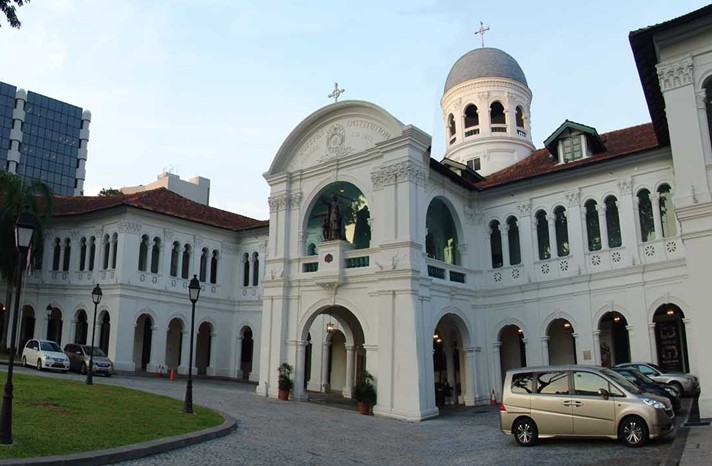 新加坡美術館坐落在新加坡最早的天主教學校圣約瑟書院舊址,這組保留完整的古希臘修道院式建筑,在新加坡十分罕見,中央建筑有兩個特征,一是成為勿拉士巴沙路象征的“三公仔”銀色塑像(中間的塑像就是基督教會學校修士學院的發起人圣約翰),二是它的銀色圓形頂樓,圓頂上還有一個十字架。