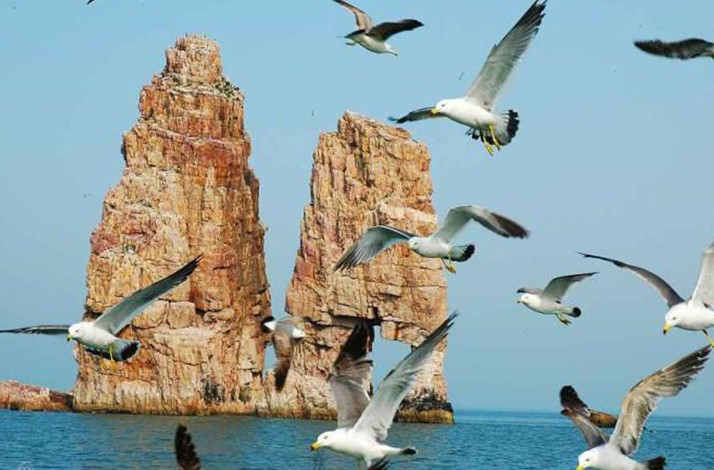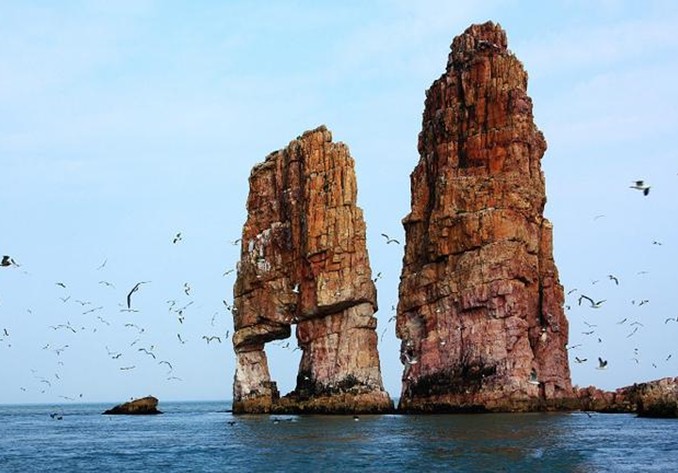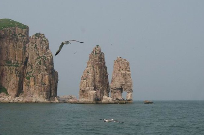 石帆礁海拔204米,是廟島群島的最高點,如同巨大的龍角從大海鉆出,直刺云天,山頂上鷗鳥盤旋、奇石林立,島周圍洞、礁、奇石遍布,并列矗立的姊妹峰巍然不動,在風浪的烘托之下,遠遠望去酷似激流勇進的風帆。