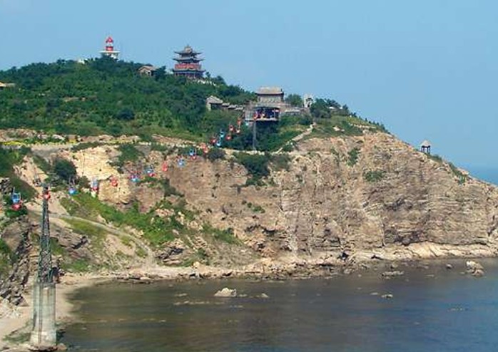 田橫山俗稱老北山,地處蓬萊陸地最北端,也是膠東半島最北端,這塊突入海中的陸地岬角稱為登州岬或蓬萊岬,是渤黃二海的分界處,具有“一山分二海”的獨特地理位置。東與丹崖山隔一小海灣相接,石壁高峻;西、北兩面半浸海中,形勢險要。漢時韓信破齊,齊王田橫率其徒五百人東走,曾筑寨于此,因此得名。明萬歷二十一年(1594年),為鞏固海防,明廷調浙江兵卒于此戍守,在山上筑起城垣和署衙廨宇。清光緒二十年(1895年),中日甲午戰起,登州統領夏辛酉在山上筑起炮臺,架起愛母斯郎炮數門,守護海口,兼為旅順之聲援。這里既有山海勝境,又有歷史遺跡,隨著旅游事業的發展,到這里探古覽勝的游人不斷增加。 1993年,田橫山與丹崖山之間架起了一條跨海索道,這里成為蓬萊閣旅游區的一個組成部分。在跨海索道上乘坐纜車,仰望前后兩側的仙山瓊閣,俯瞰大海的萬里澄波,聯想三神山的迷人神話,會不由自主地產生一種飄飄欲仙的感覺。(跨海索道全長481米,高點海拔50.7米,相對落差26.3米,采用單循環半包吊椅式結構,共設纜座54個,日可載客5340人次,是山東省第一條海上索道。它區別于其它索道的地方就是可以搭乘纜車領略海上風光,在感受上是別有情趣的。